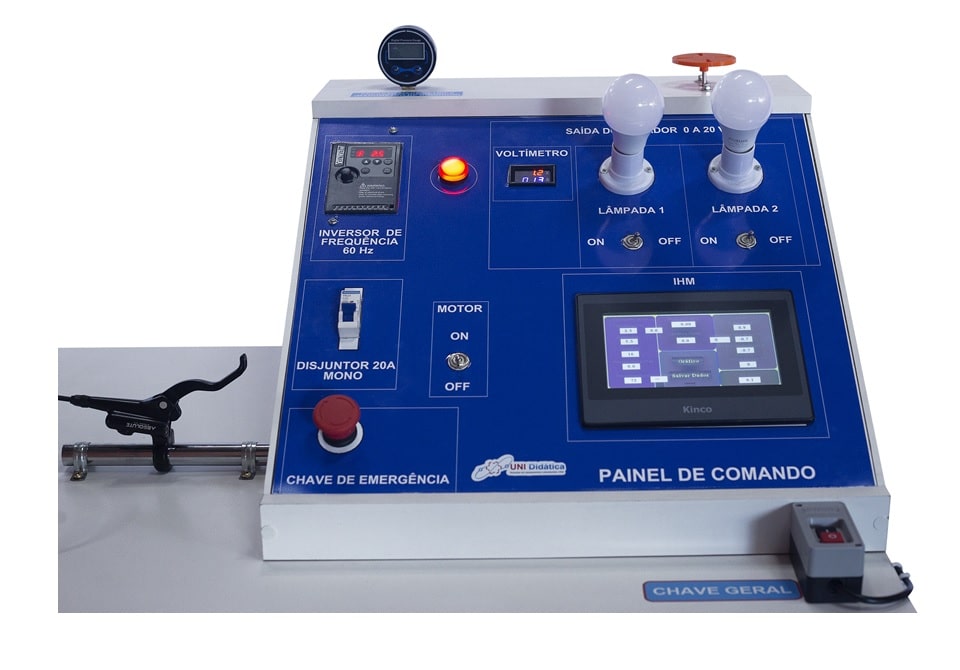 • Acoplado a turbina possuí um gerador para geração de energia, no painel esta localizado medidores da saída  do gerador, o painel possui um CLP e IHM onde é possível ver a vazão LPH, corrente, tensão, rendimento global, consumo de energia, carga (torque), gráficos e coleta de dados.