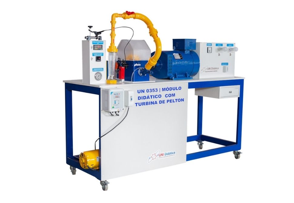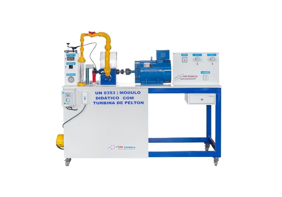 A Unidade Didática UN 0353 é projetada para realizar experimentos na área de Sistemas Fluido mecânicos, permite conhecer, analisar e estudar as principais características e aplicações de turbinas hidráulicas, neste caso, modelo Pelton, a bancada didática é capaz de realizar o levantamento das curvas características de uma turbina do tipo Pelton através de medidas de vazão e pressão do fluído na entrada da turbina, assim como rotação e torque gerados pela turbina, de forma que seja possível o cálculo do seus rendimentos e potências geradas. A bancada permite o controle da vazão e pressão do fluido fornecido a turbina, regulagem da agulha do bico injetor da turbina Pelton.