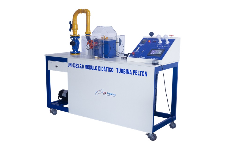 A Unidade Didática UN 0353.2.0 é projetada para realizar experimentos na área de Sistemas Fluido mecânicos, permite conhecer, analisar e estudar as principais características e aplicações de turbinas hidráulicas, neste caso, modelo Pelton, a bancada didática é capaz de realizar o levantamento das curvas características de uma turbina do tipo Pelton através de medidas de vazão e pressão do fluído na entrada da turbina, assim como rotação e torque gerados pela turbina, de forma que seja possível o cálculo do seus rendimentos e potências geradas. A bancada permite o controle da vazão e pressão do fluido fornecido a turbina, regulagem da agulha do bico injetor da turbina Pelton.